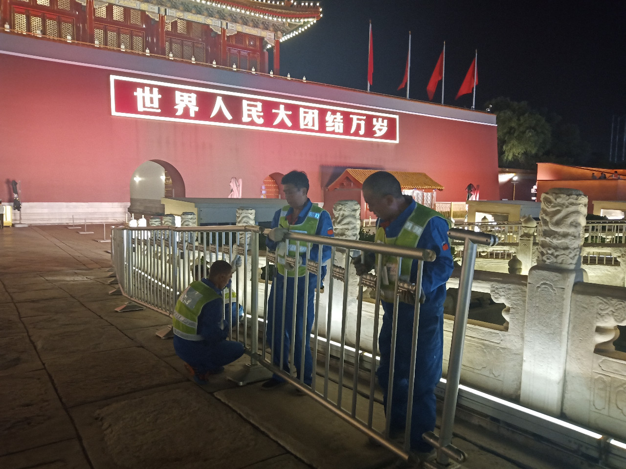 閱兵及群眾慶祝活動結束后,10月2日從凌晨1點開始到6點半結束,從早上7點半到10點結束,組織近500人分別完成天安門及廣場周邊地區、金水橋護欄全面恢復。