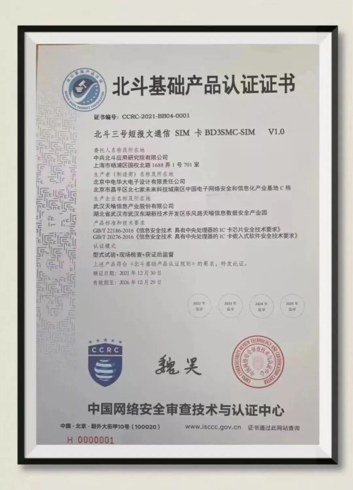 北斗三號短報文通信SIM卡獲國家市場監督管理總局北斗基礎產品認證