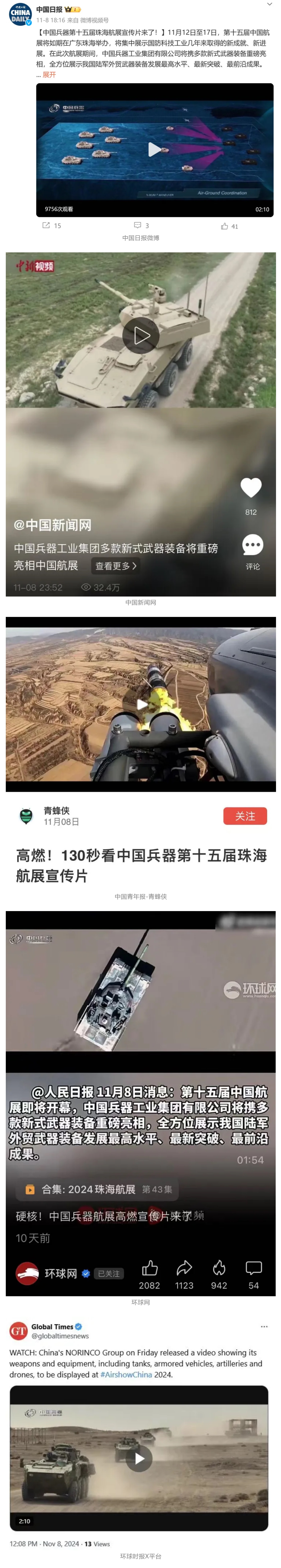 人民日報微博、新華社客戶端、央視軍事微博、中國軍號微博、央視軍事報道微博、中國日報微博、中國新聞網、中國青年報-青蜂俠、環球網、環球時報(臉書、X平臺)、學習強國中央企業學習平臺、共青團中央微博、國資委網站等20余家中央主流媒體、國家部委的新媒體第一時間播發集團公司航展宣傳片等視頻作品燃爆全網,累計閱讀量突破1200萬人次。集團公司微信公眾號、微博、抖音號、快手號、微信視頻號、知乎號等新媒體宣傳片播放閱讀量近1000萬人次,點贊近20萬人次。